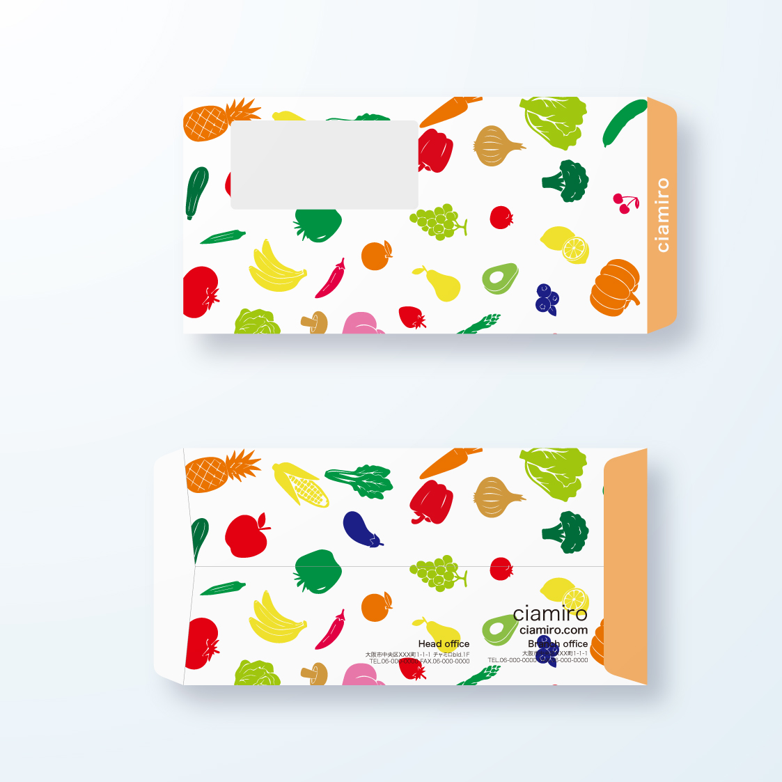 【洋長3封筒】カラフルなフルーツ&ベジタブルのポップロゴ