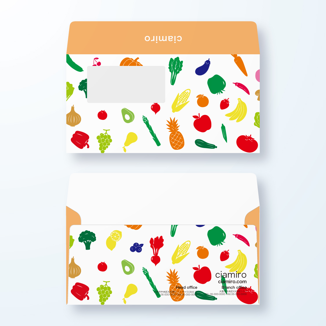 【洋形長3号 窓付き封筒】カラフルなフルーツ&ベジタブルのポップロゴ